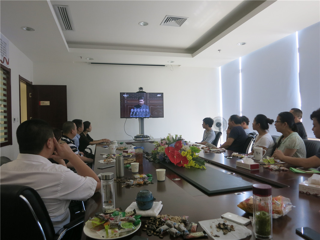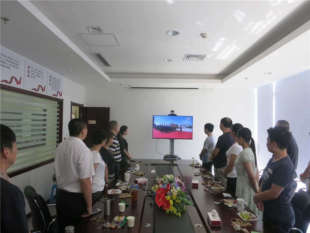 看着电视上天安门广场前整齐的队列,威武的军容,大家都为阅兵仪式的雄壮威严与国力的强大而震撼和自豪,纷纷感慨伟大祖国抗战胜利70年后翻天覆地的变化。当听到国务院总理李克强宣布升国旗、奏国歌,电视这头的员工们全体起立如同在现场一样唱起了国歌。阅兵仪式进行中,大家安奈不住激动的心情并由衷的竖着大拇指,伴随着仪仗队的出场会议室一次次响起热烈的掌声。
