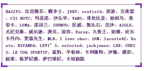 威可多、弗萨尼、ELLE、布鲁尼、堡尼、圣大保罗、堡马、诺帝卡、MVIO、梵伦斯、DEICAE、蔓哈顿、I'm David、杰凡尼、古柏、TRENDIANO、Pancoat、拉拉波波、EVISU、ENO、Sneaky、GANESH、布克尼克、三星道、滨波户外、诺贝达、杰太罗、恺米切、鄂尔多斯